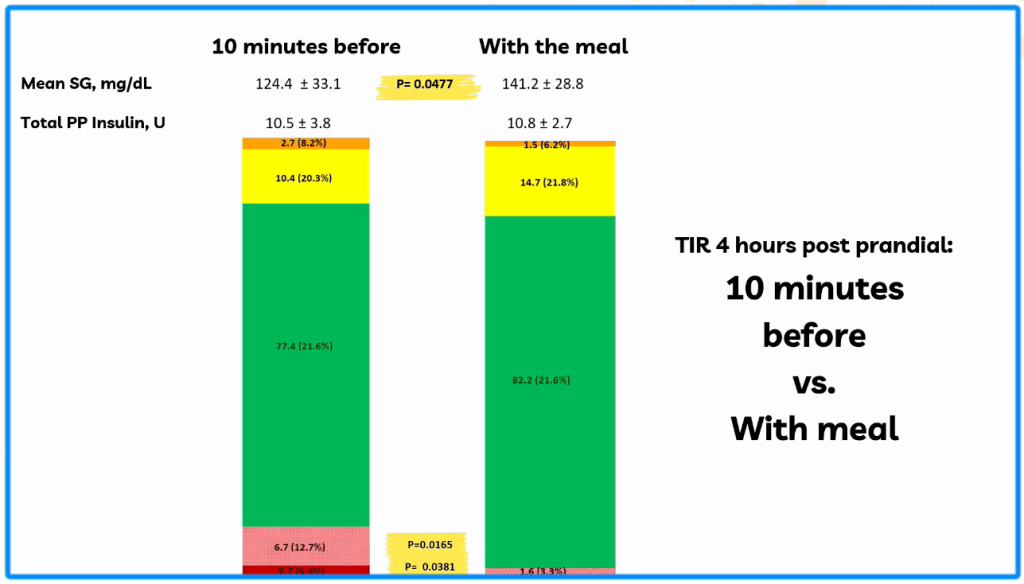 Results showed that for this particular meal type, the highest time in range (3.9-10mmol/L) was obtained by bolusing at the time of the meal, not before it.