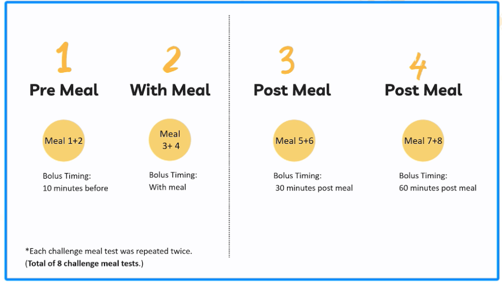 - Meal bolus was given at four different points and each of the meal timing scenarios was repeated (8 meals in all)